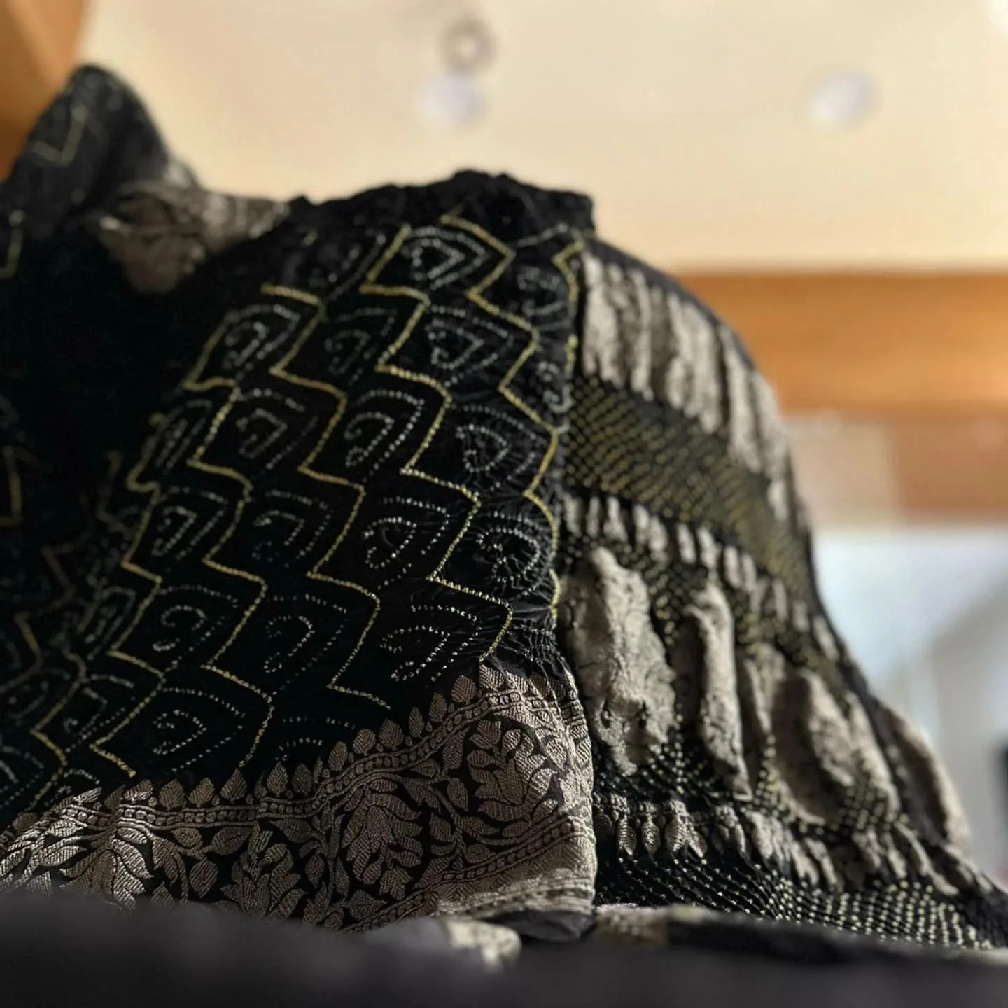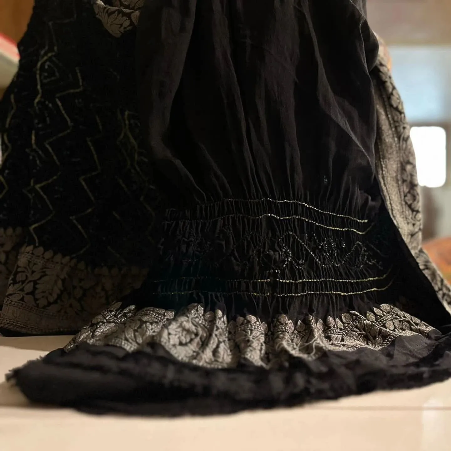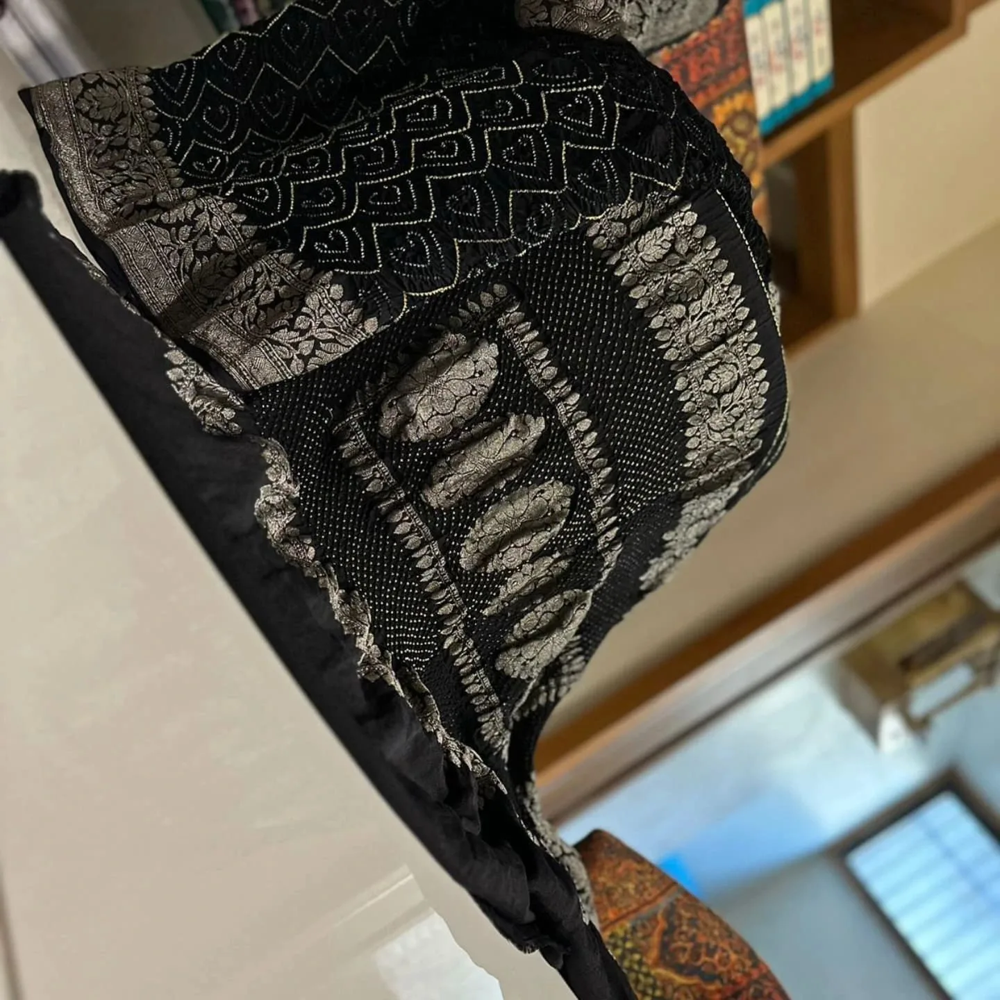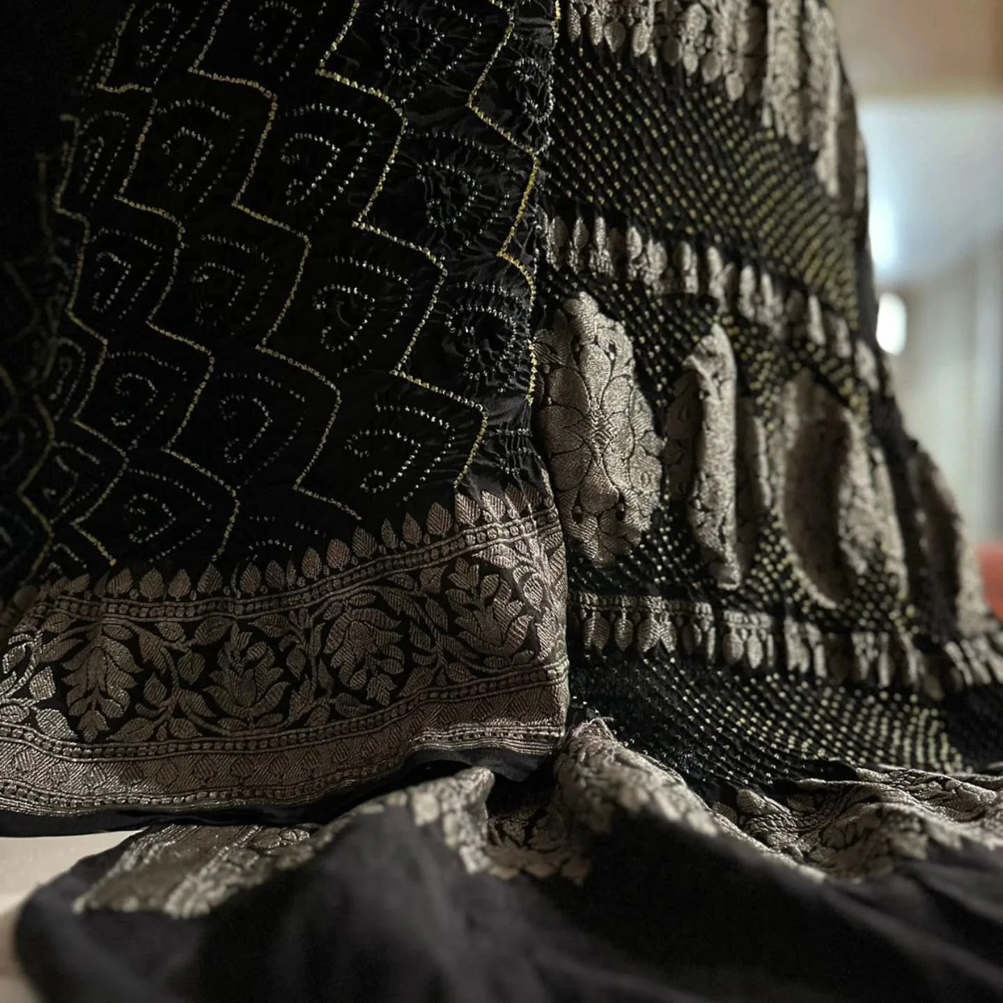 A stunning black Banarasi georgette saree with intricate raie bandhej patterns and antique zari work.