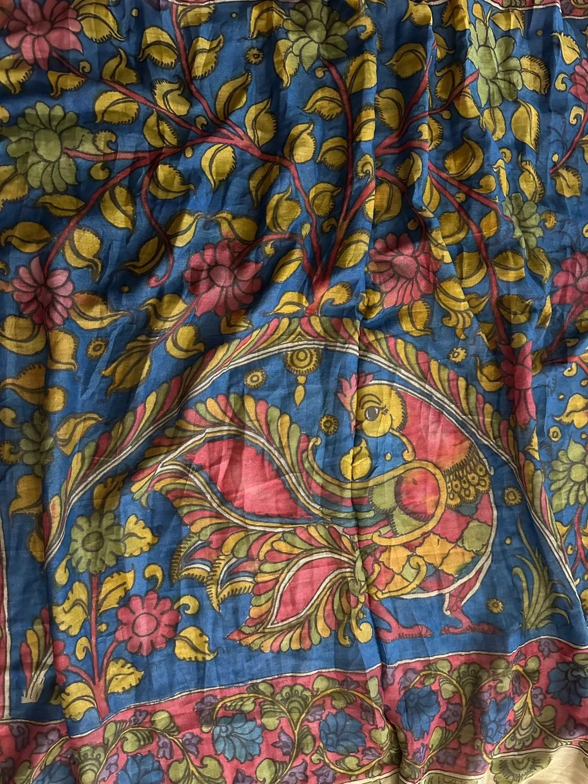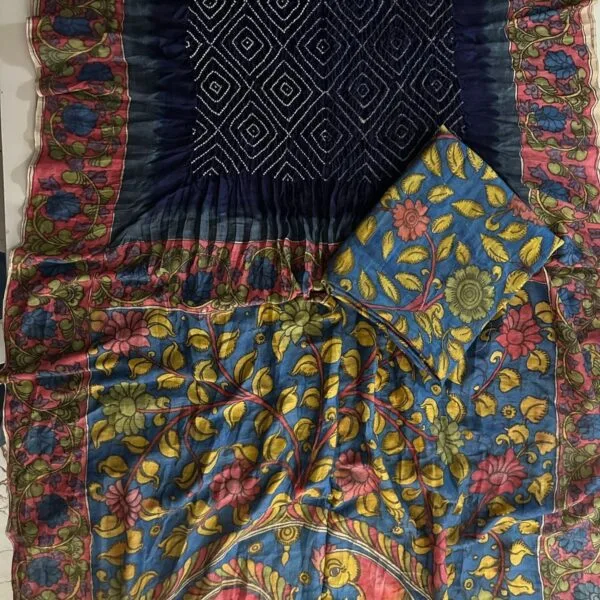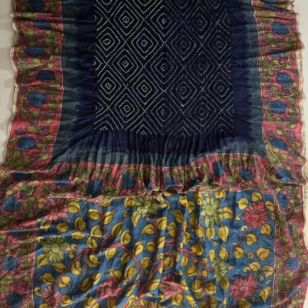 हैवी बंधेज और कलमकारी के साथ एक आकर्षक साड़ी। ब्लाउज और पल्लू बॉर्डर पर हाथ से बनी कलमकारी।