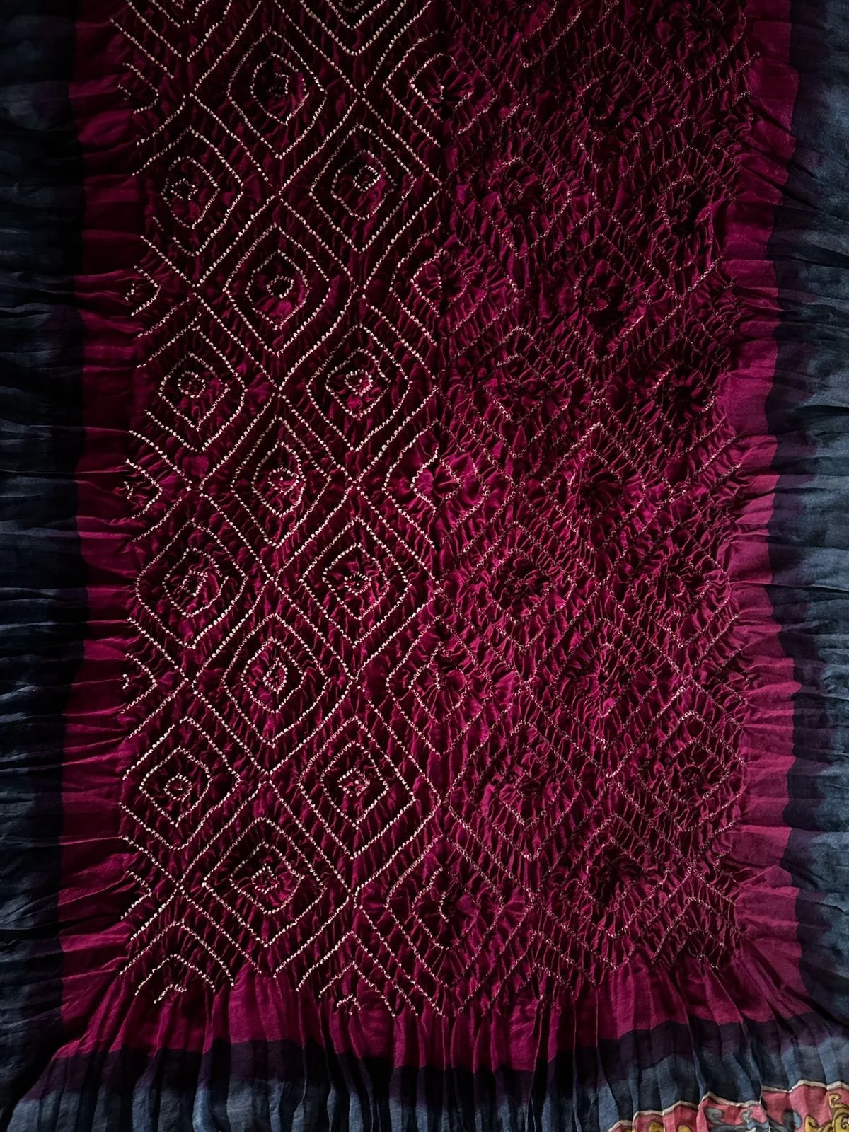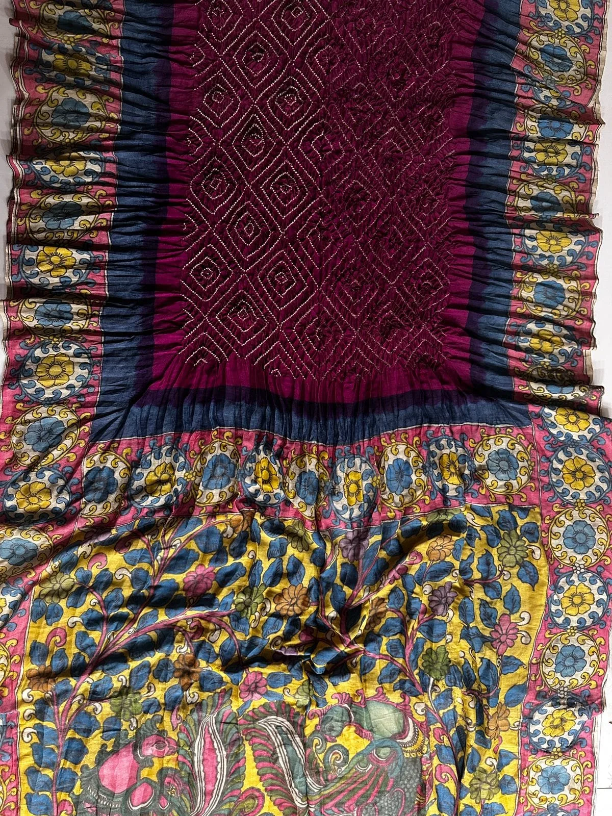एक खूबसूरत हाथ से पेंट की गई कलमकारी बंधेज साड़ी, बारीक बंधेज और कलमकारी काम के साथ। बनारसी मुंगा सिल्क पर बनाई गई है।