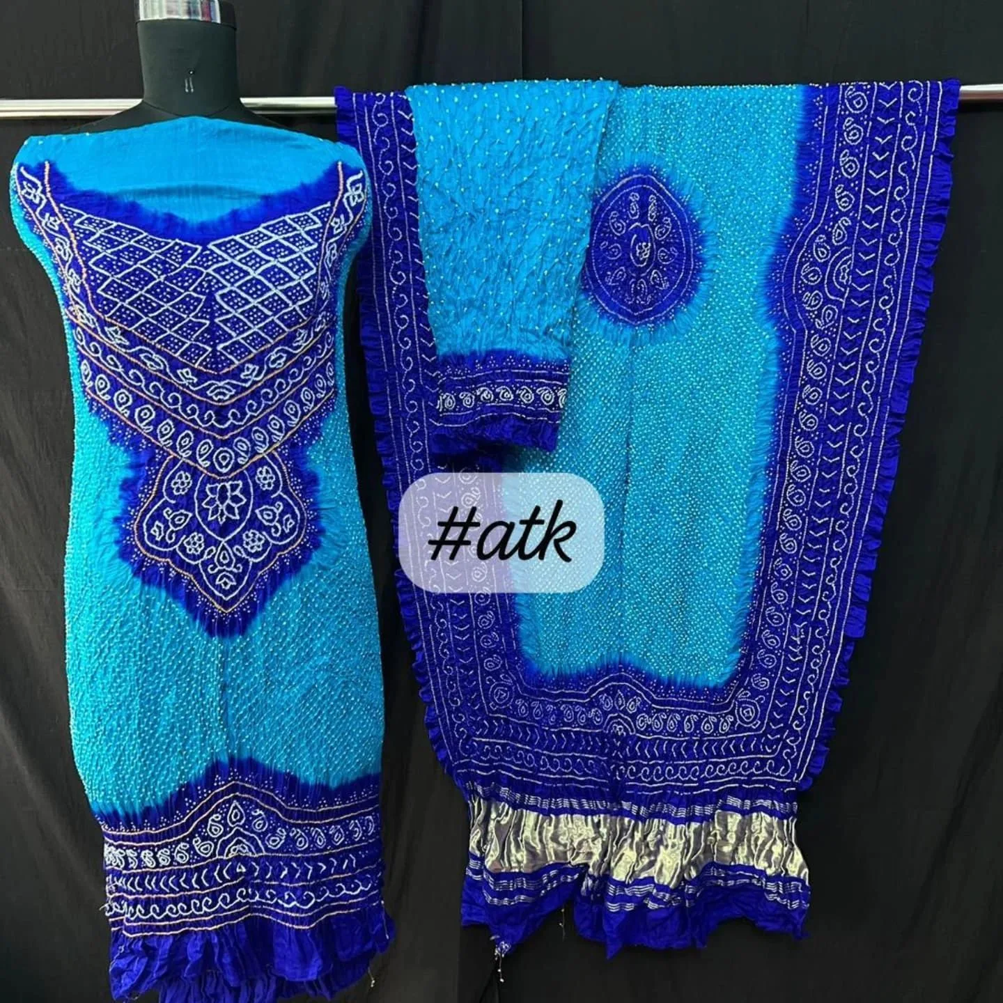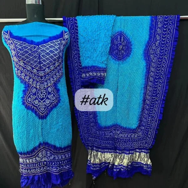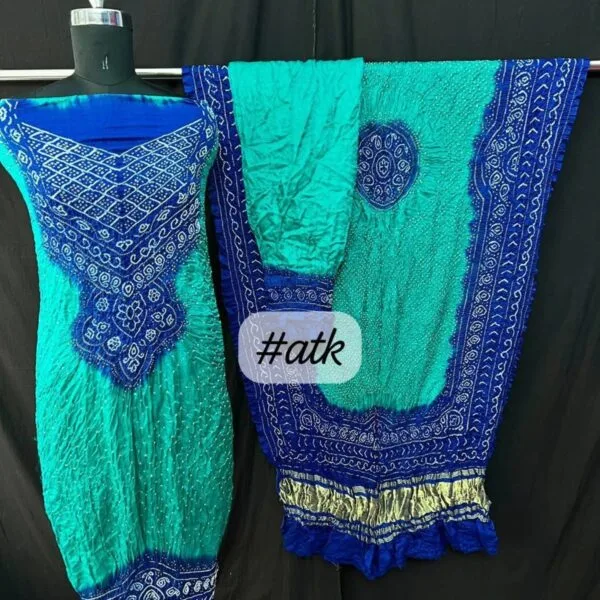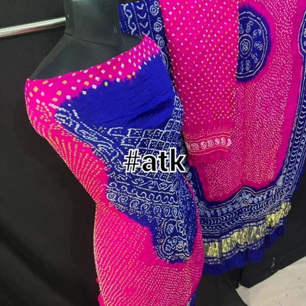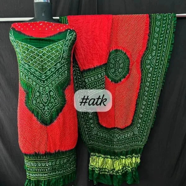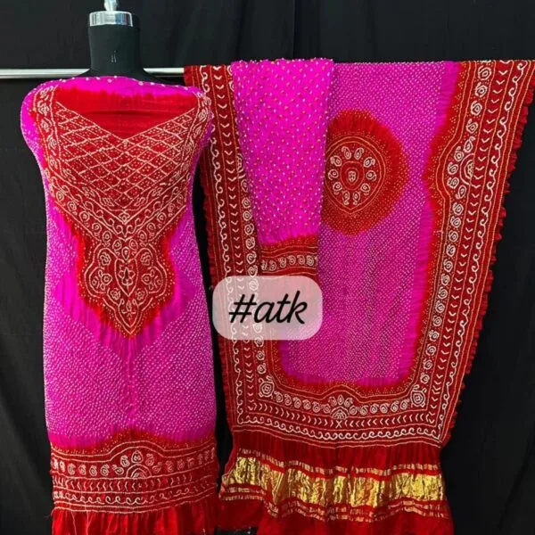Luxurious pure gaji silk dress material with intricate bandhani design. Perfect for creating stunning outfits.