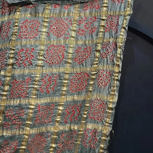 A beautiful pure gaji silk Ghar Chola saree with a vibrant multi-colored pallu and intricate rai bandhej patterns.